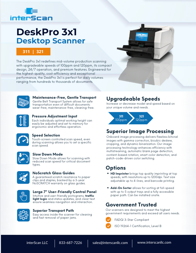 The DeskPro 3x1 delivers high-quality, cost-efficient mid-volume scanning with upgradeable speeds of up to 120ppm, 24/7 operation, and a compact, durable design—ideal for daily workloads from hundreds to thousands of pages.