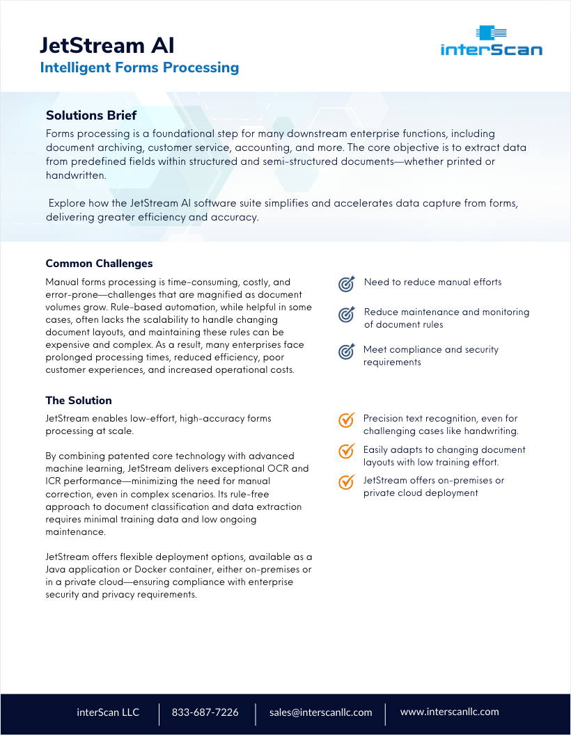 See how JetStream effortlessly transforms high-volume document processing in Forms Handling and unmatched OCR/ICR accuracy—even in complex cases—thanks to advanced machine learning that minimizes manual correction.